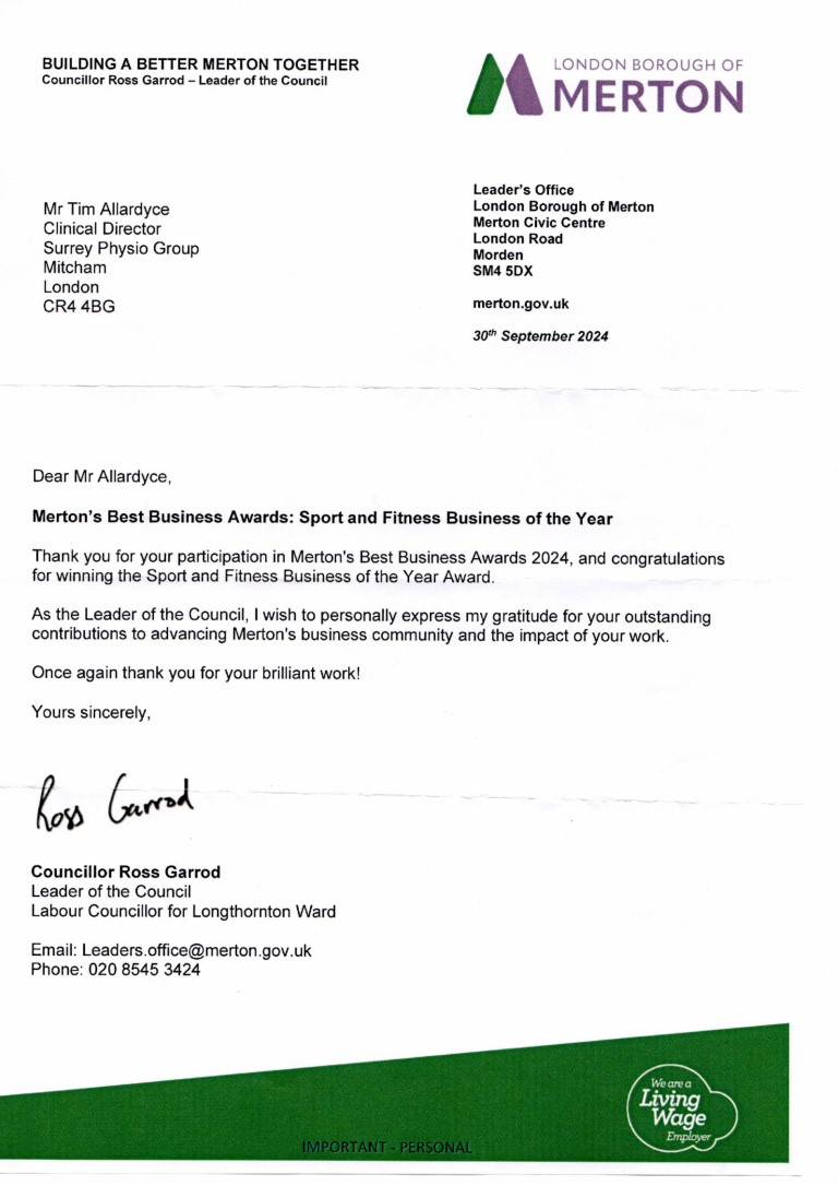 Surrey Physio were honoured to receive a letter from Councillor Ross Garrod, Leader of the Council, with his warm congratulations. Thank you Ross! We’re grateful to work with Merton Council, a very forward thinking and supportive Council.